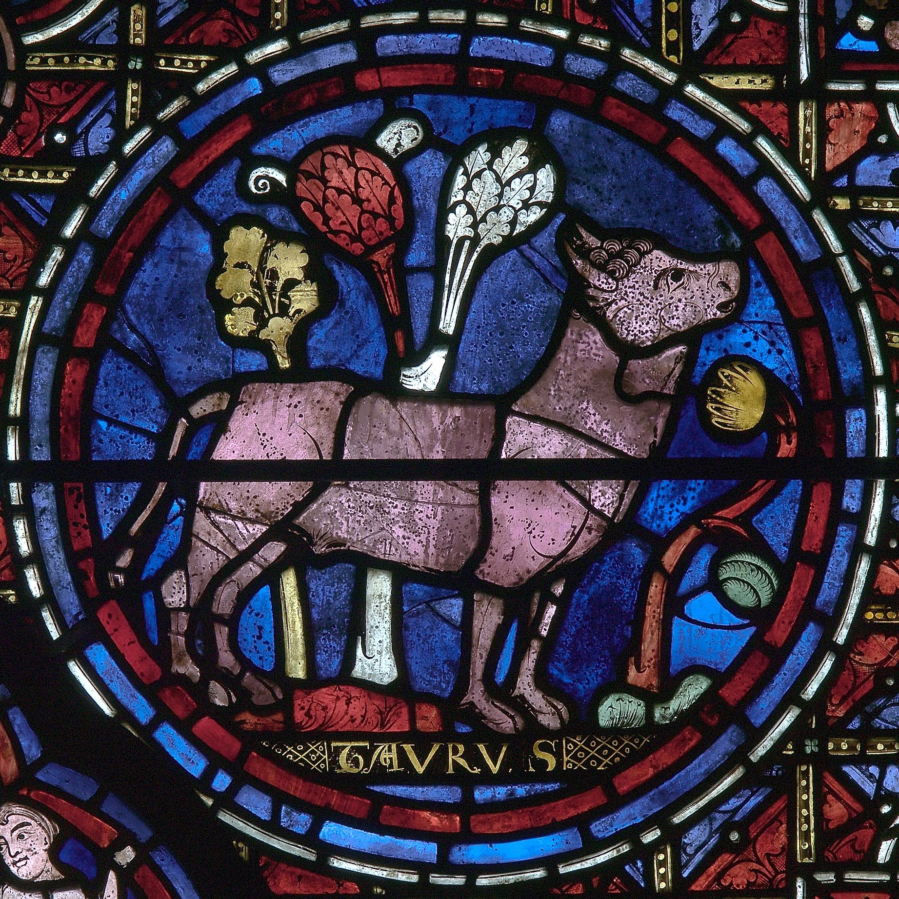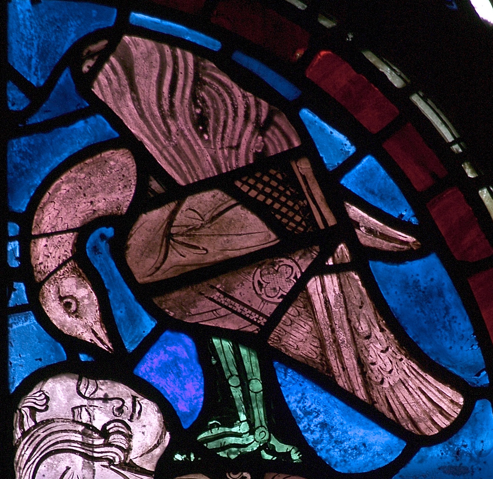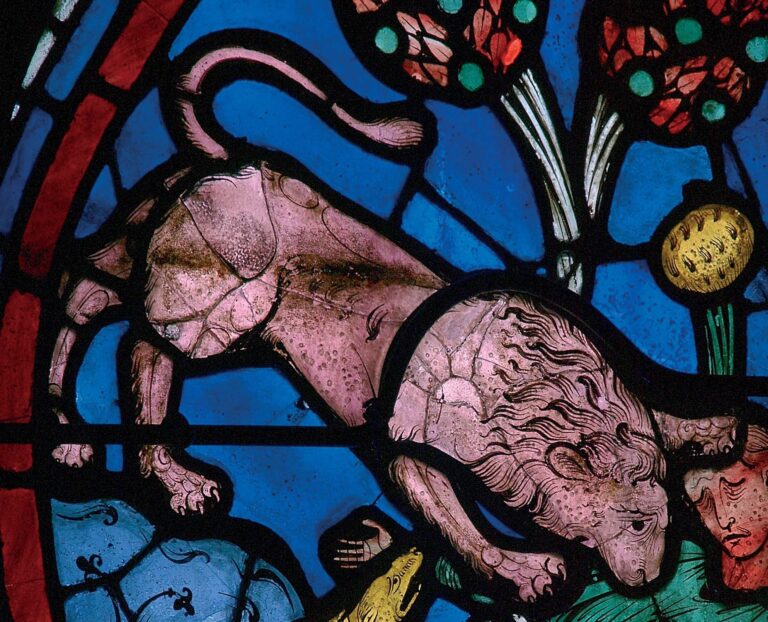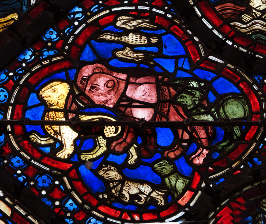 C’est ainsi qu’à Chartres, on découvre tout un bestiaire inattendu aux couleurs surprenantes. Dans le vitrail de Noé, l’éléphant est rose, et le vautour également. Dans la verrière du zodiaque ou celle de saint Thomas, ce sont des lions aux pelages rosés qui apparaissent. Le cheval de Charlemagne lui-même arbore un poil rose, et jusque dans le zodiaque, poissons et taureau se parent de teintes rosées. Rien d’absurde aux yeux des verriers : le vitrail n’est pas là pour reproduire la nature, mais pour la transfigurer. La lumière dicte ses propres règles, et le rose, plus lisible et plus éclatant que le gris, remplissait ce rôle à merveille.